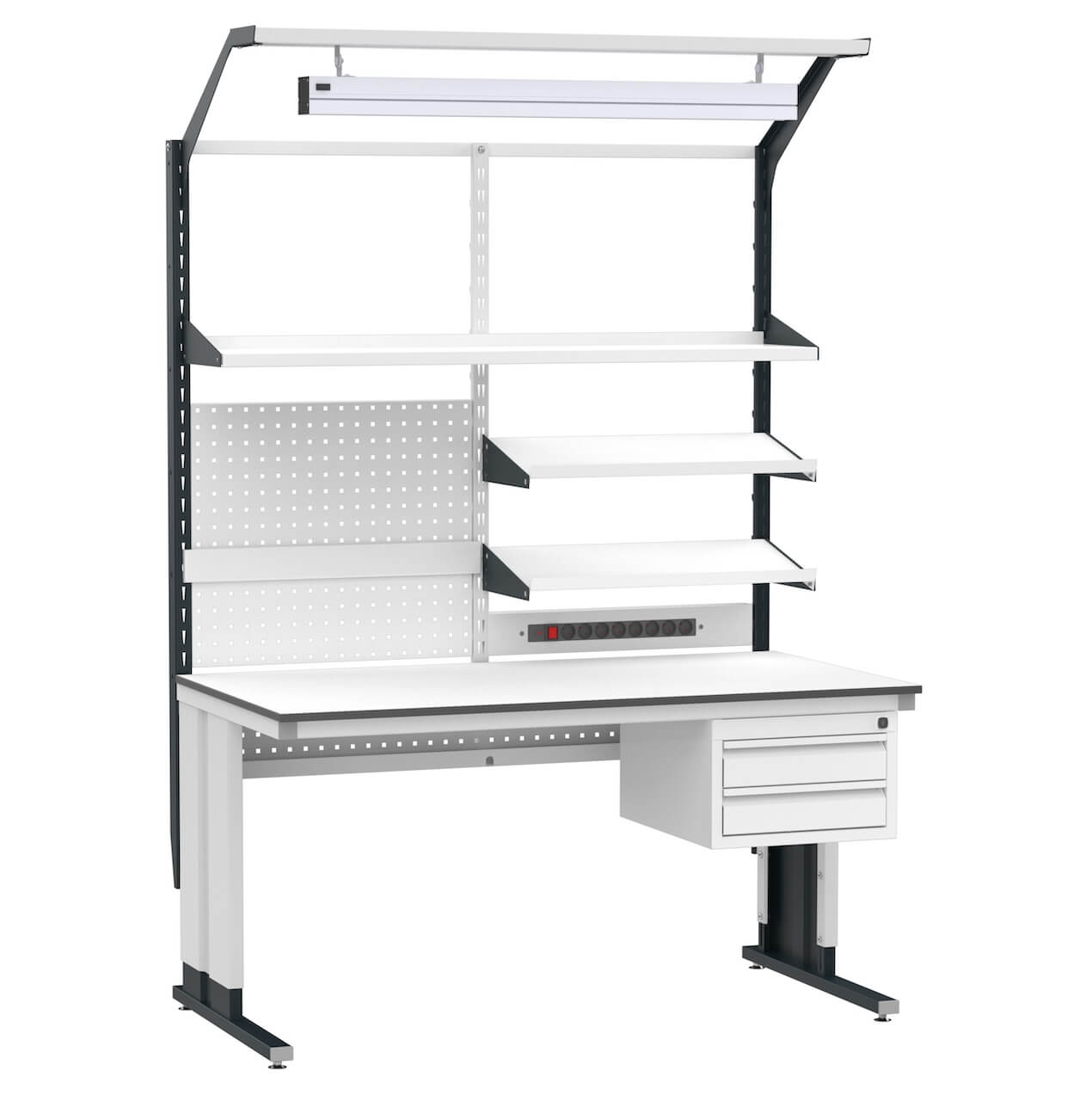 The Summit Flex ESD Workstation is an advanced, ergonomically designed solution for workplaces requiring electrostatic discharge (ESD) protection. Featuring C-foot construction, this model combines stability and functionality. It comes equipped with essential accessories such as a shelf, drawer module, power strip, and LED lighting, making it an ideal choice for modern, static-safe work environments.